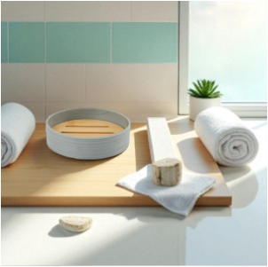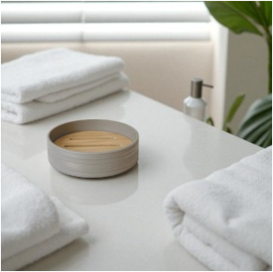 Jabonera redonda rayada de plastico beige